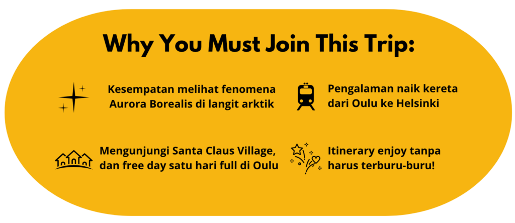 - Peserta dapat menikmati Optional Tour berupa Mobile Northern Lights Hunt (biaya tambahan) untuk berburu Aurora Borealis