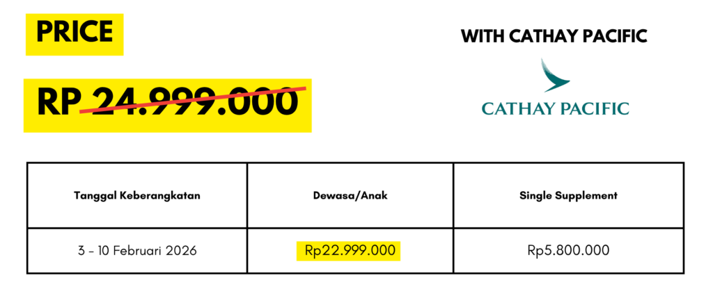 1. Harga berlaku Min 35 peserta apabila jumlah peserta kurang dari Kuota maka pihak agent berhak untuk menginformasikan harga update. Harga sudah termasuk tax (TAX dapat berubah sewaktu – waktu baik dengan pemberitahuan atau tanpa pemberitahuan).